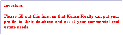Contact Information *First Name *Last Name Middle Initial Title Organization Street Address Address (cont.) City State/Province Zip/Postal Code Country Work Phone Home Phone FAX *E-mail URL Property Purchase Preferences Multi-Tenant Shopping Centers Single Tenant Net Leased Investments Multi-Residential/Apartment Buildings Ground Leases Industrial Desired Price Range $1,000,000 and Under$1,000,000 to $3,000,000$3,000,000 to $5,000,000$5,000,000 and overAny Price Range Investment Status I am currently in a 1031 Exchange I am looking to purchase additional property I will be selling a property in the near future Have Kenco Realty contact me about selling my property Additional Comments